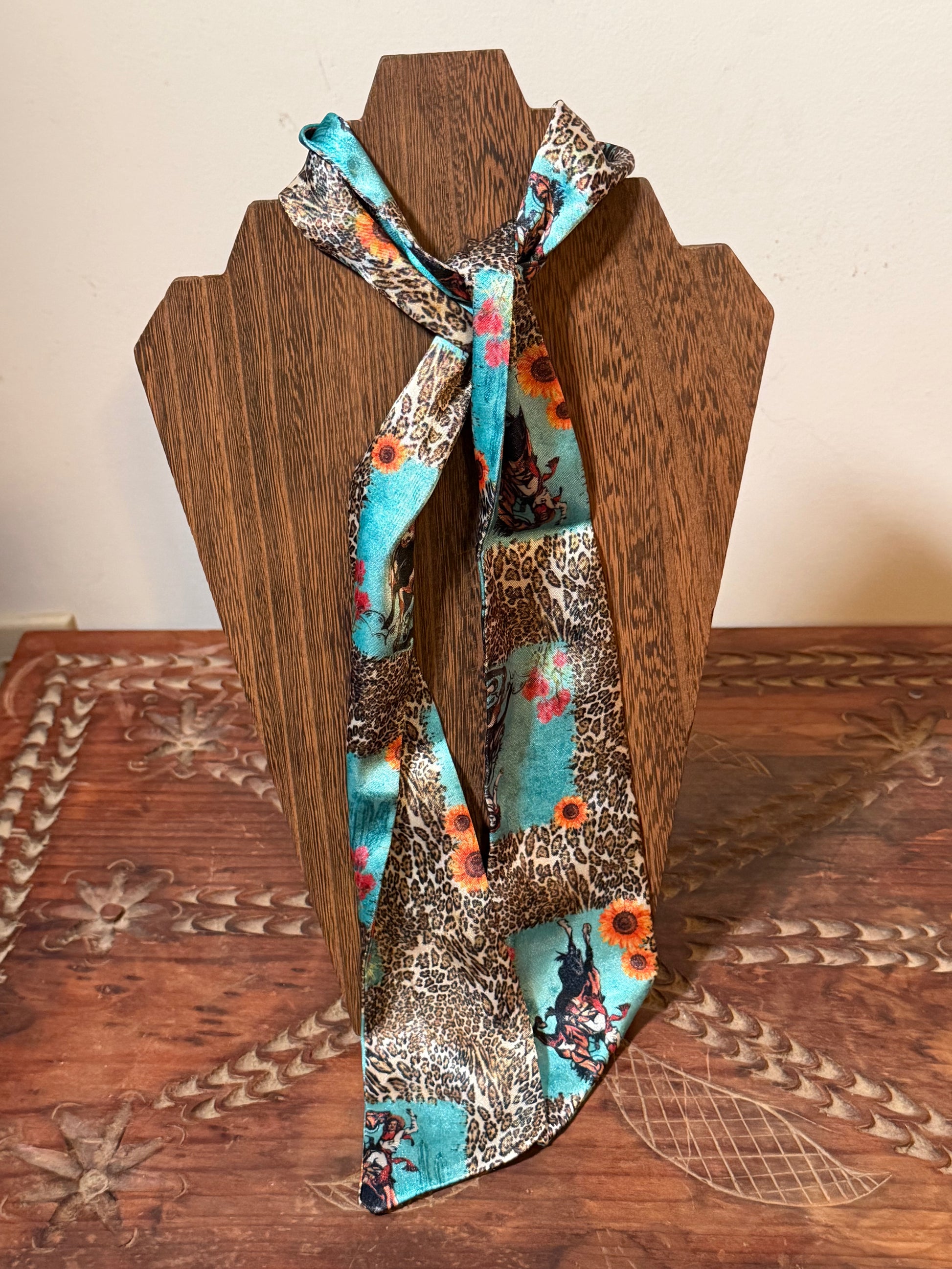 Great cheetah background with cowgirls and turquoise. Twillys are 2” by 45”.