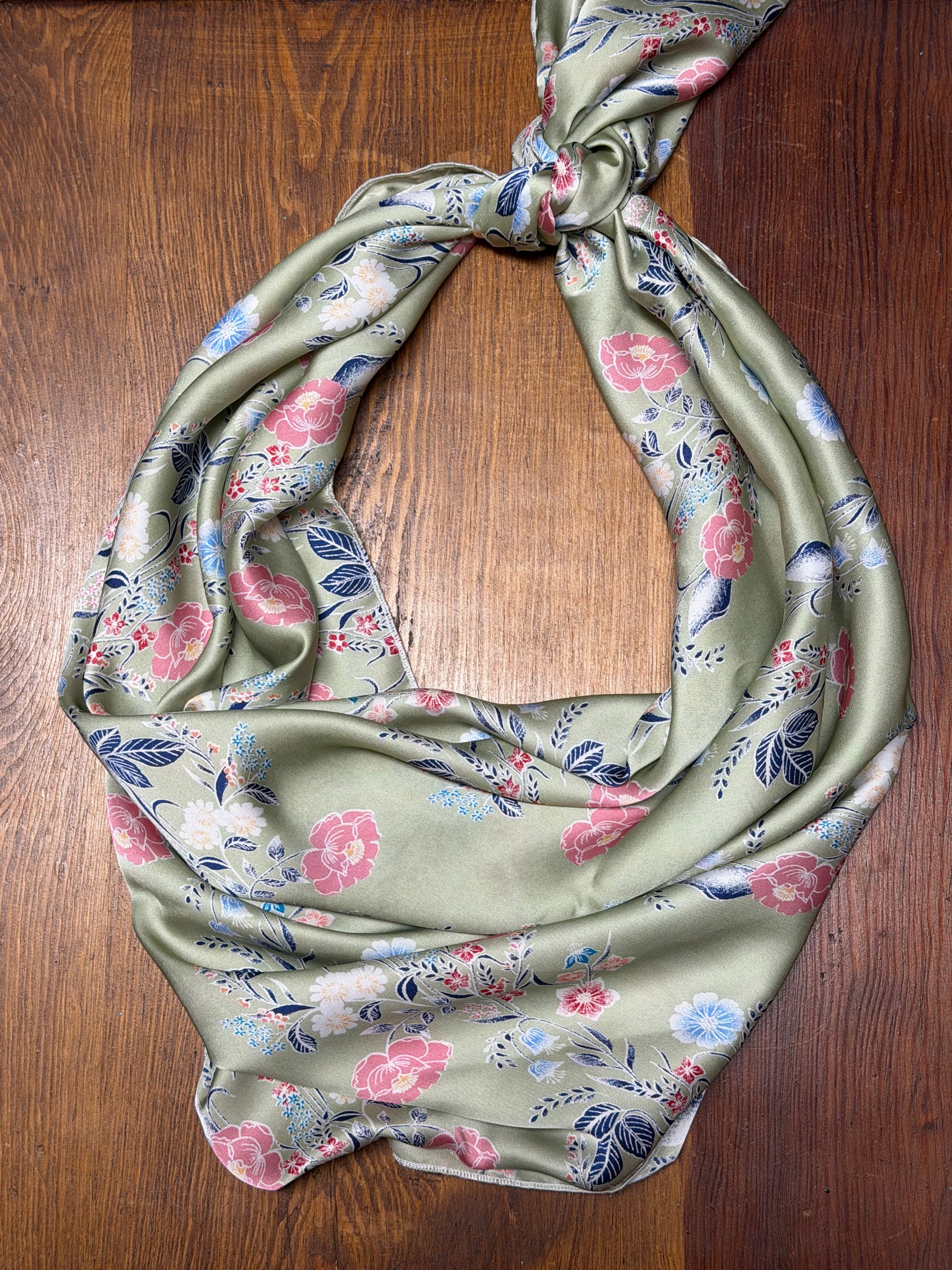 This 40” wild rag is on a sage green background with a floral pattern including pink.