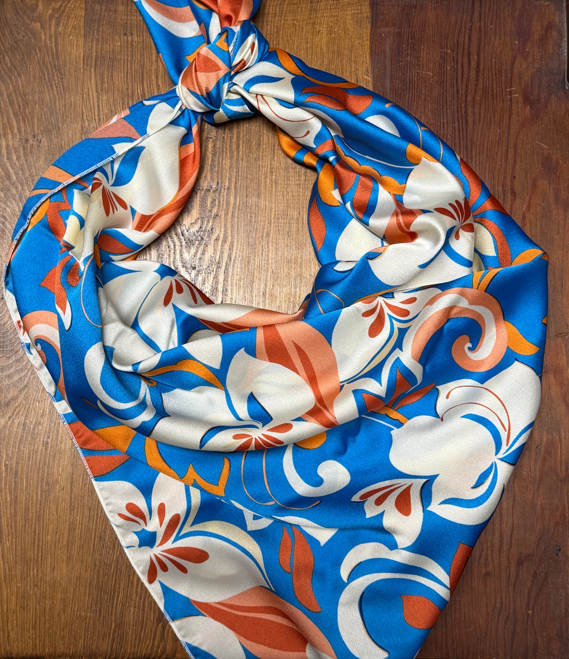 This 40” wild rag has a fun white and orange floral pattern on a turquoise background.