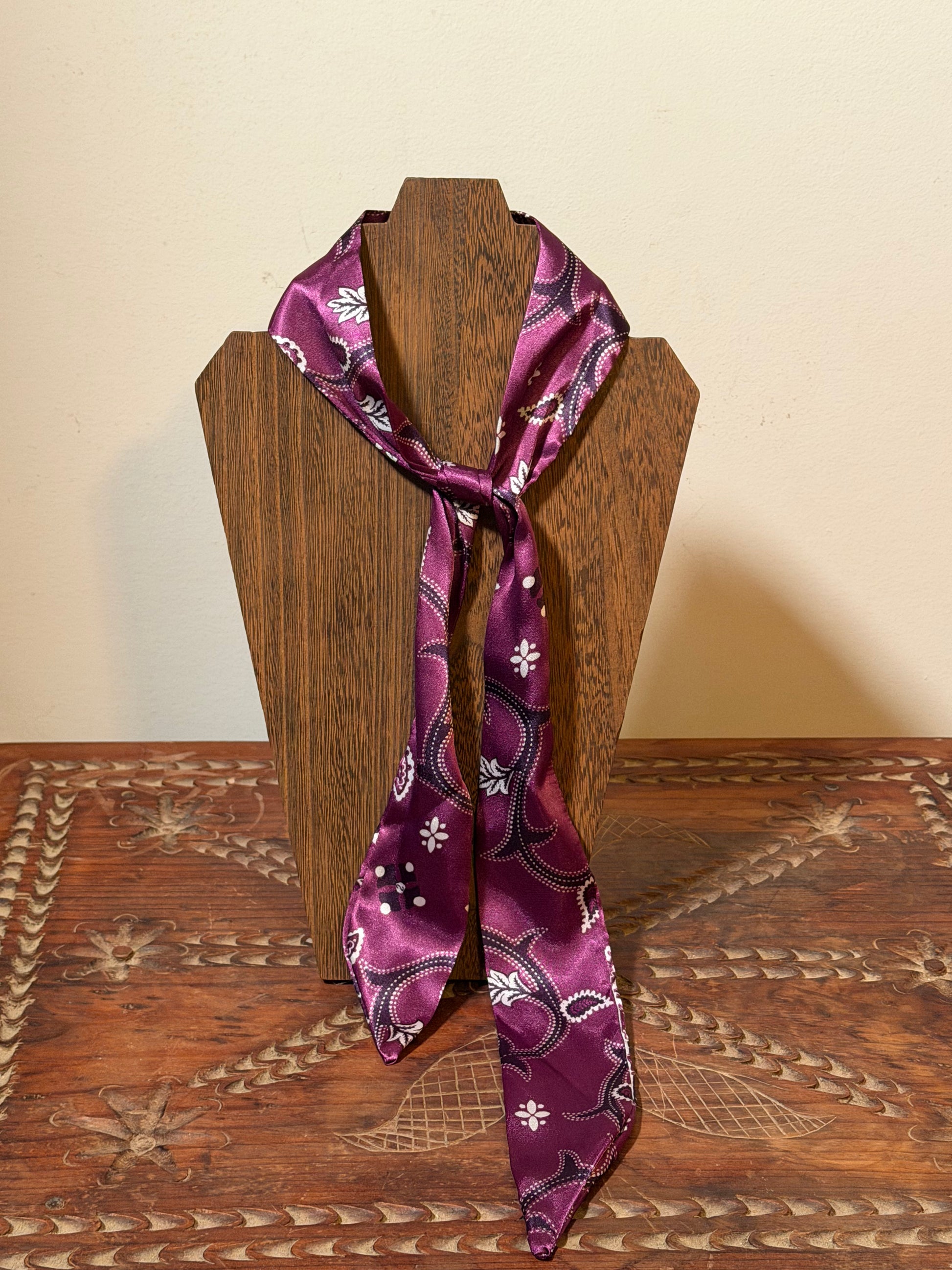 This classic western paisley bootstitch pattern on a deep rich purple background. Twillys measure 2” by 45”.