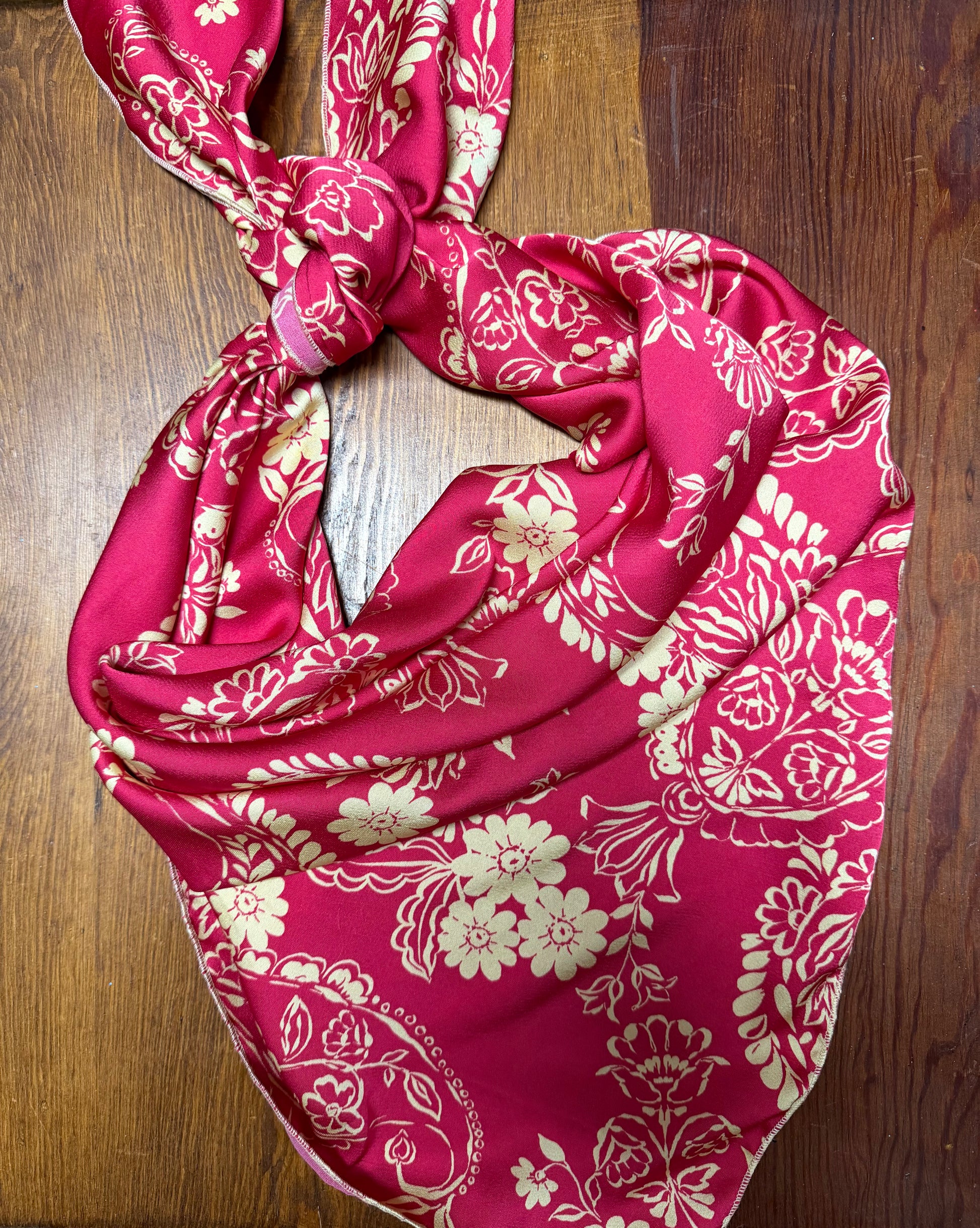 This 40” wild rag gives all the southern girl vibes with its vibrant pink background and off white pattern.