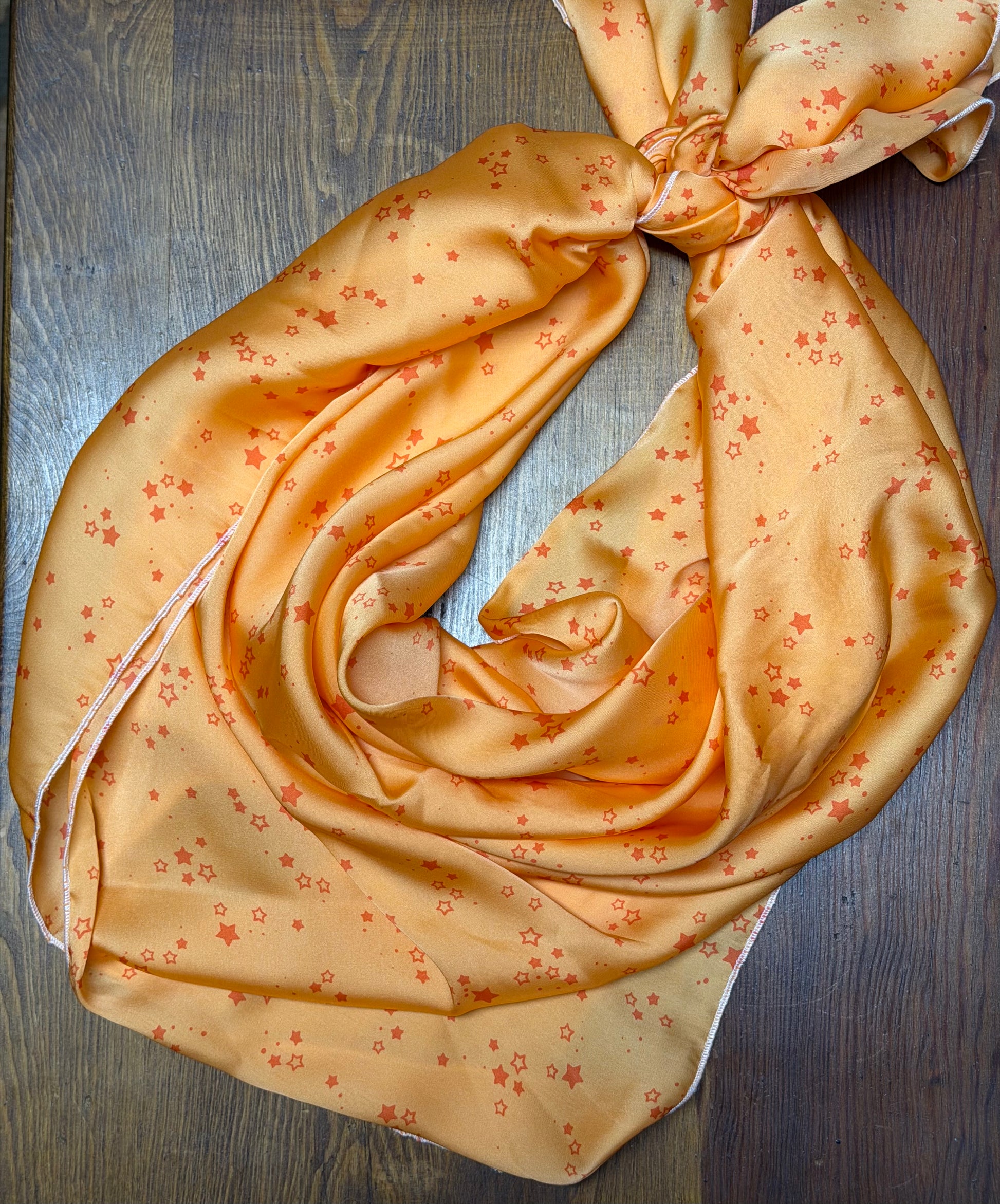 This fun wild rag is full of dainty small stars on a bright orange background. This wild rag measures 40”.