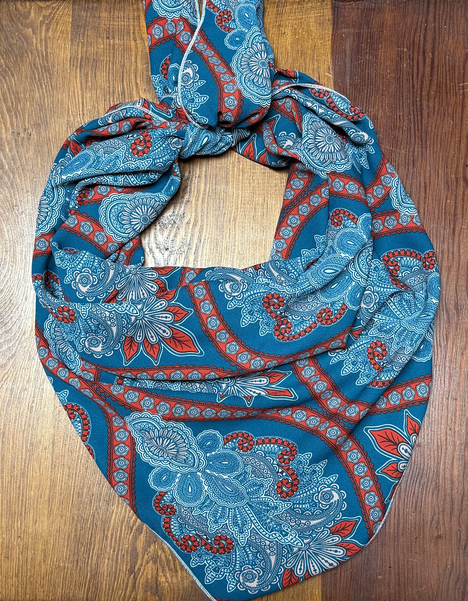This 40” wild rag is on a deep dark rich turquoise background with white and red paisley design.